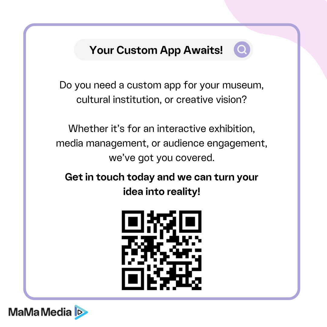Our standalone or check-in applications, known as Mama Satellite Apps, power an ever-growing range of media-driven use cases created to transform how museums, cultural institutions, and event spaces deliver and interact with digital content. Fully integrated with the Mama.Platform, these apps enable interactive kiosks, presentation tools, and much more—redefining visitor engagement and the whole media experience.
